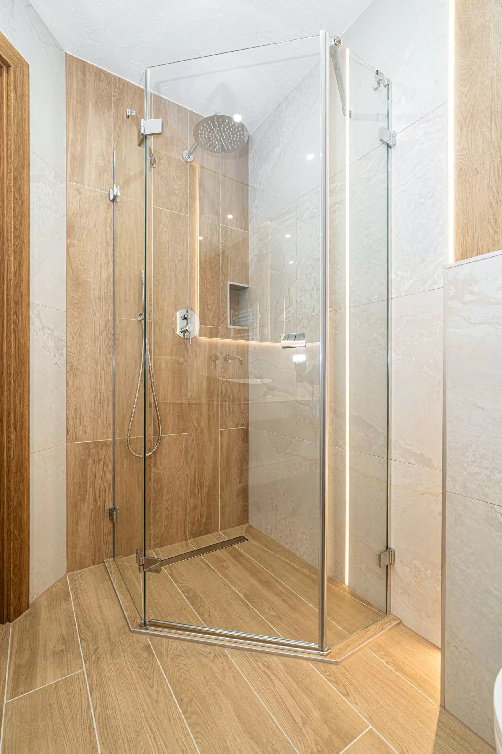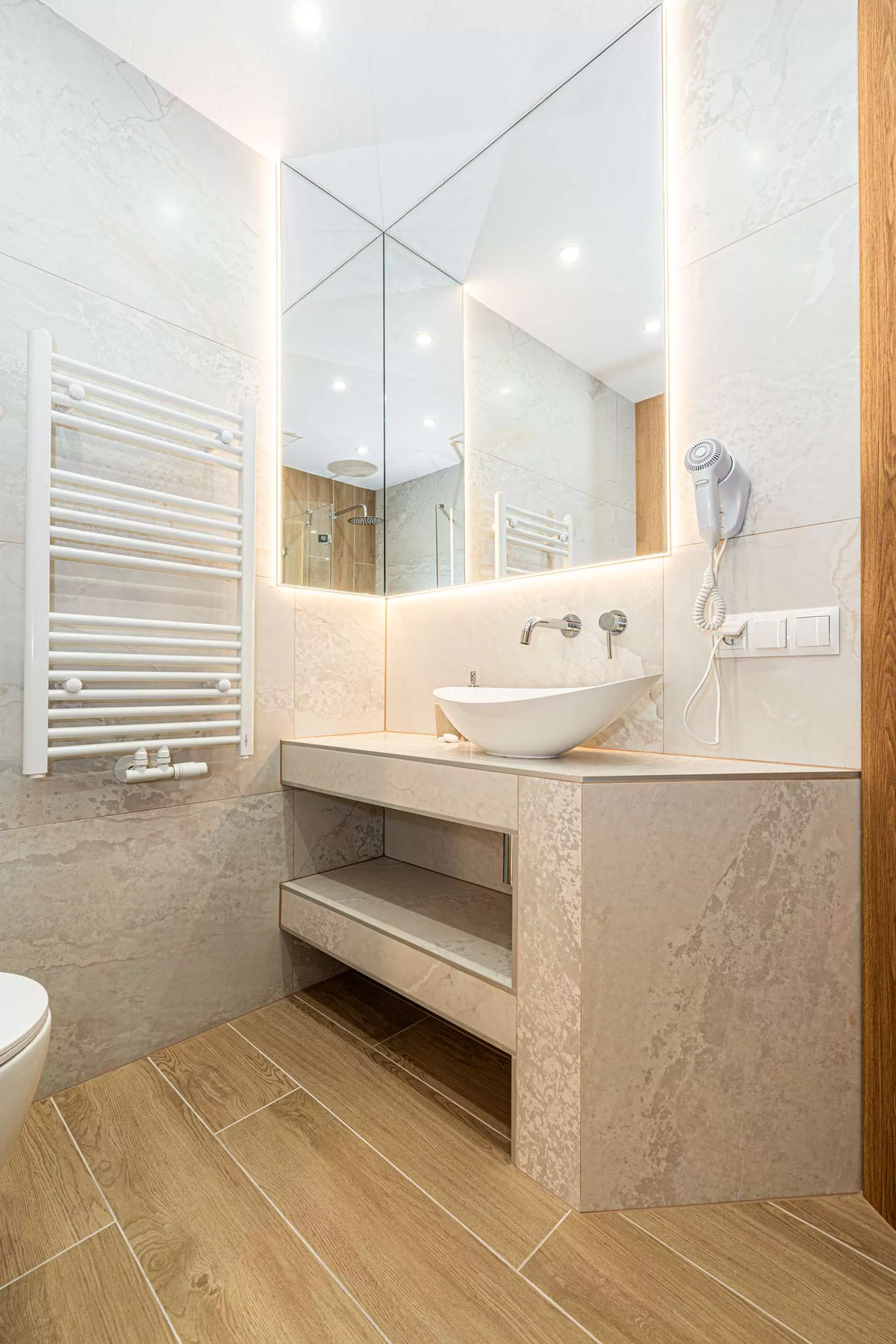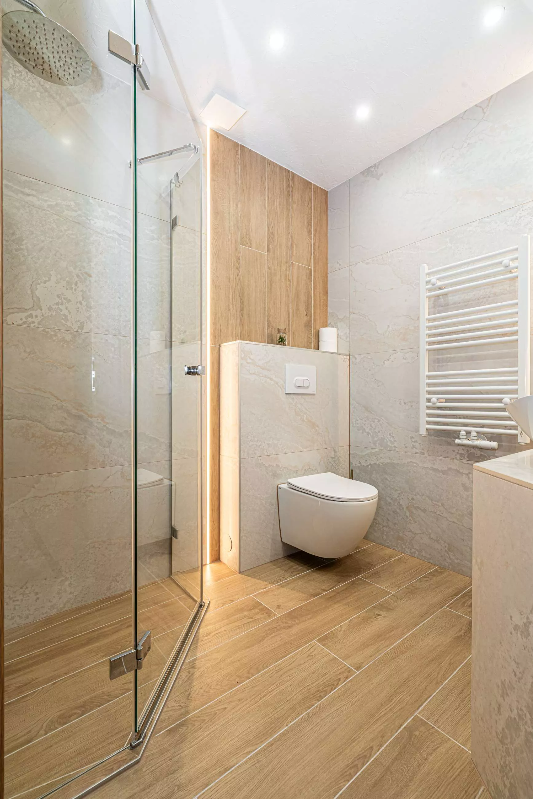 Łazienka: prysznic, toaleta, umywalka, szafka, lustro, suszarka, ręczniki.
