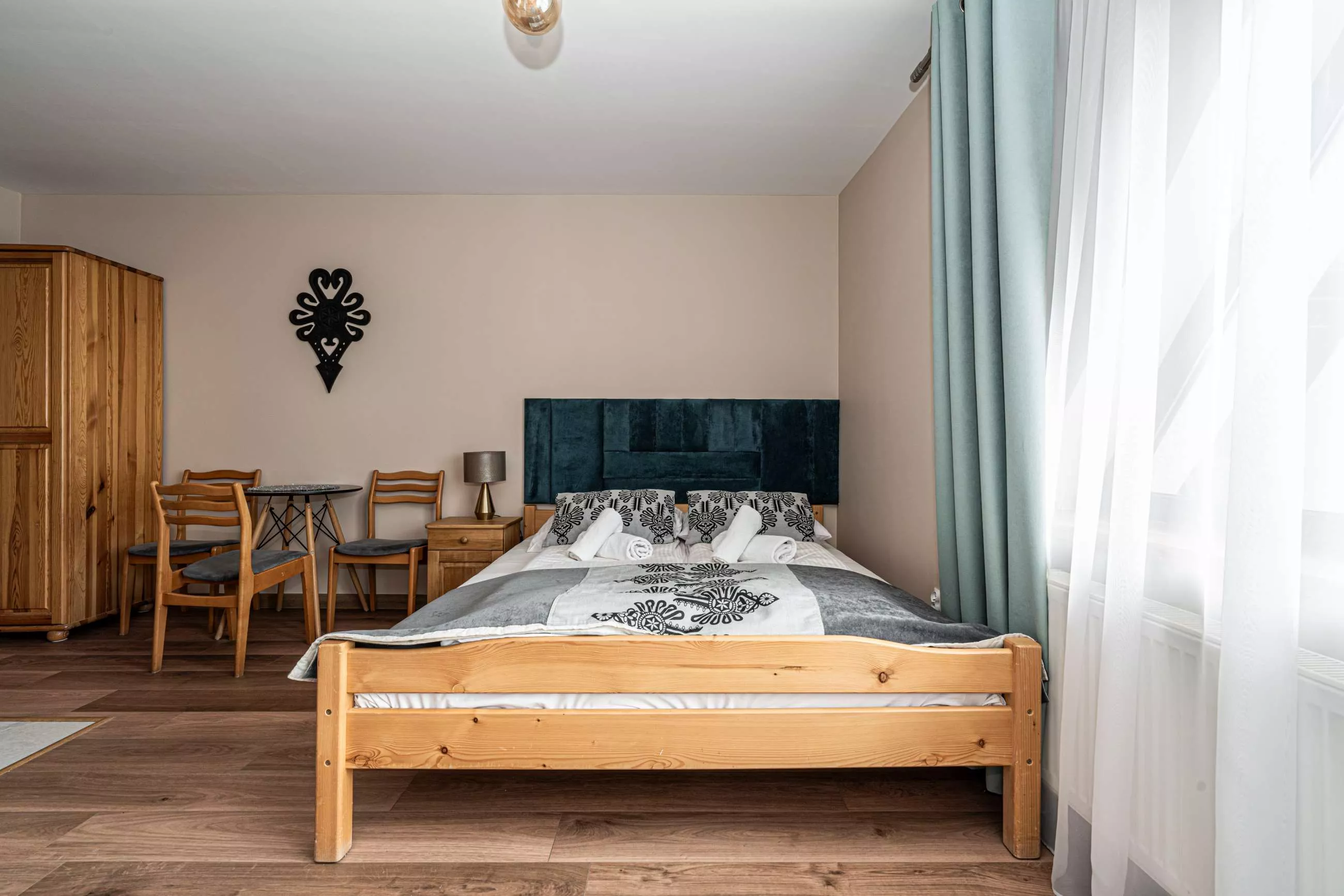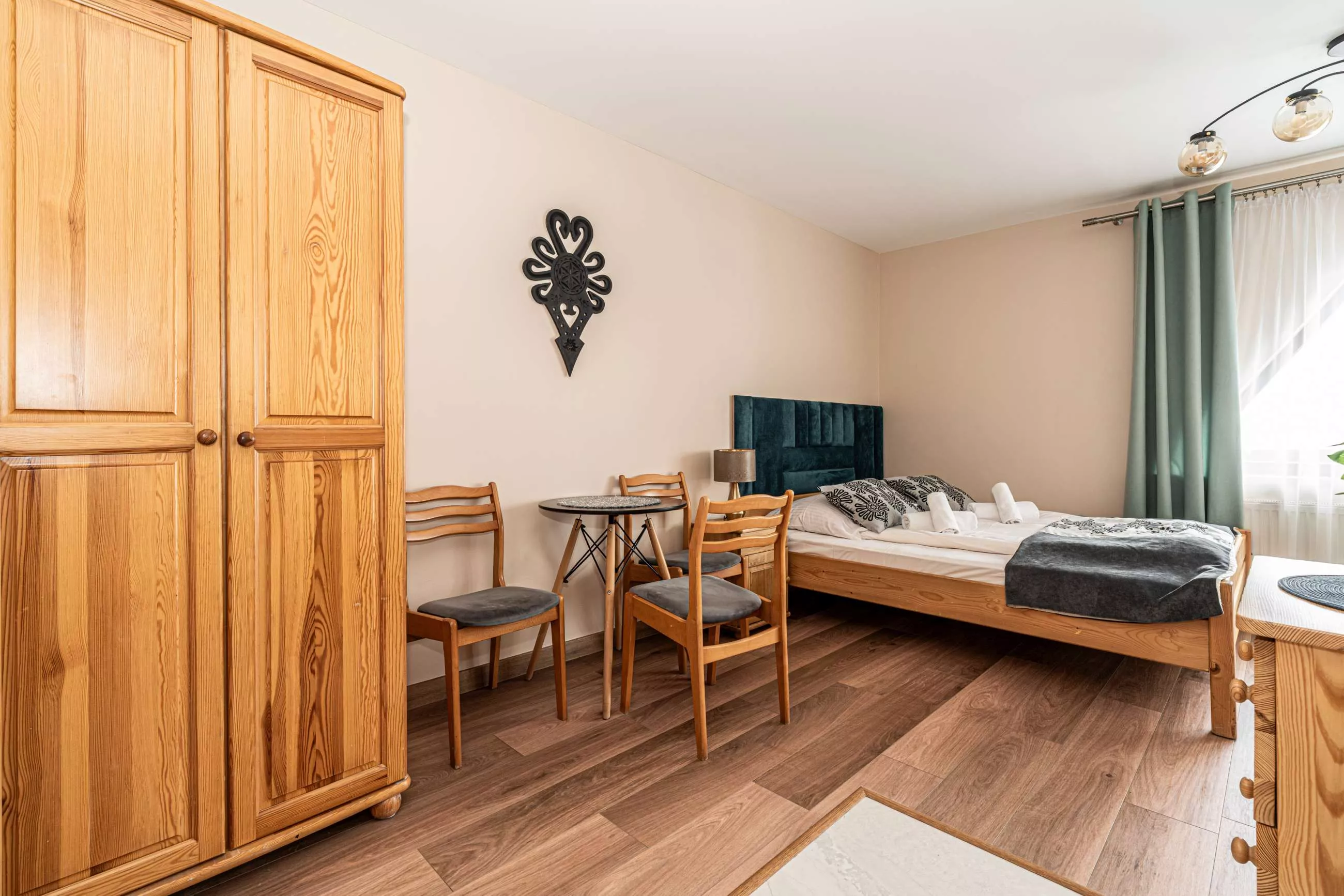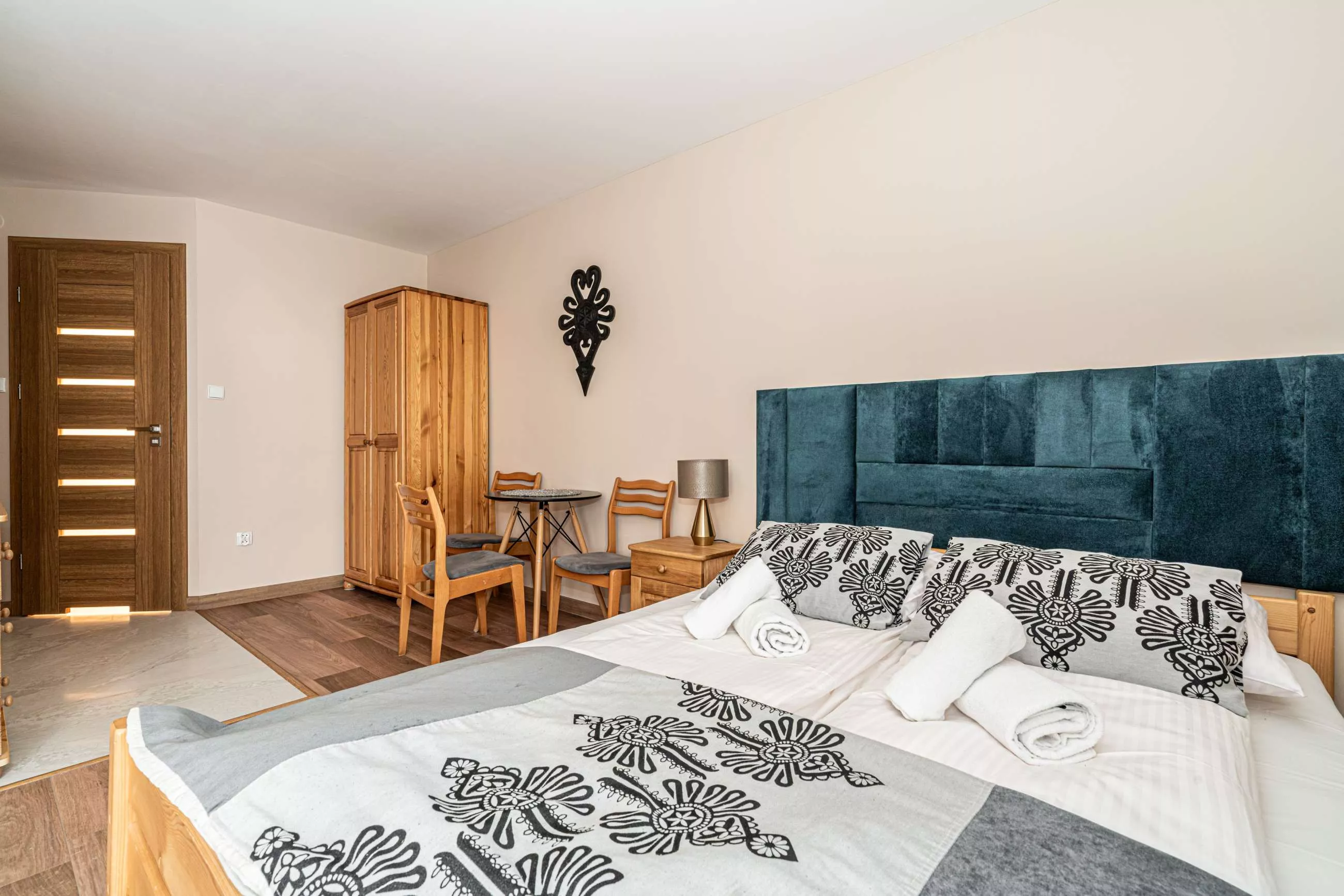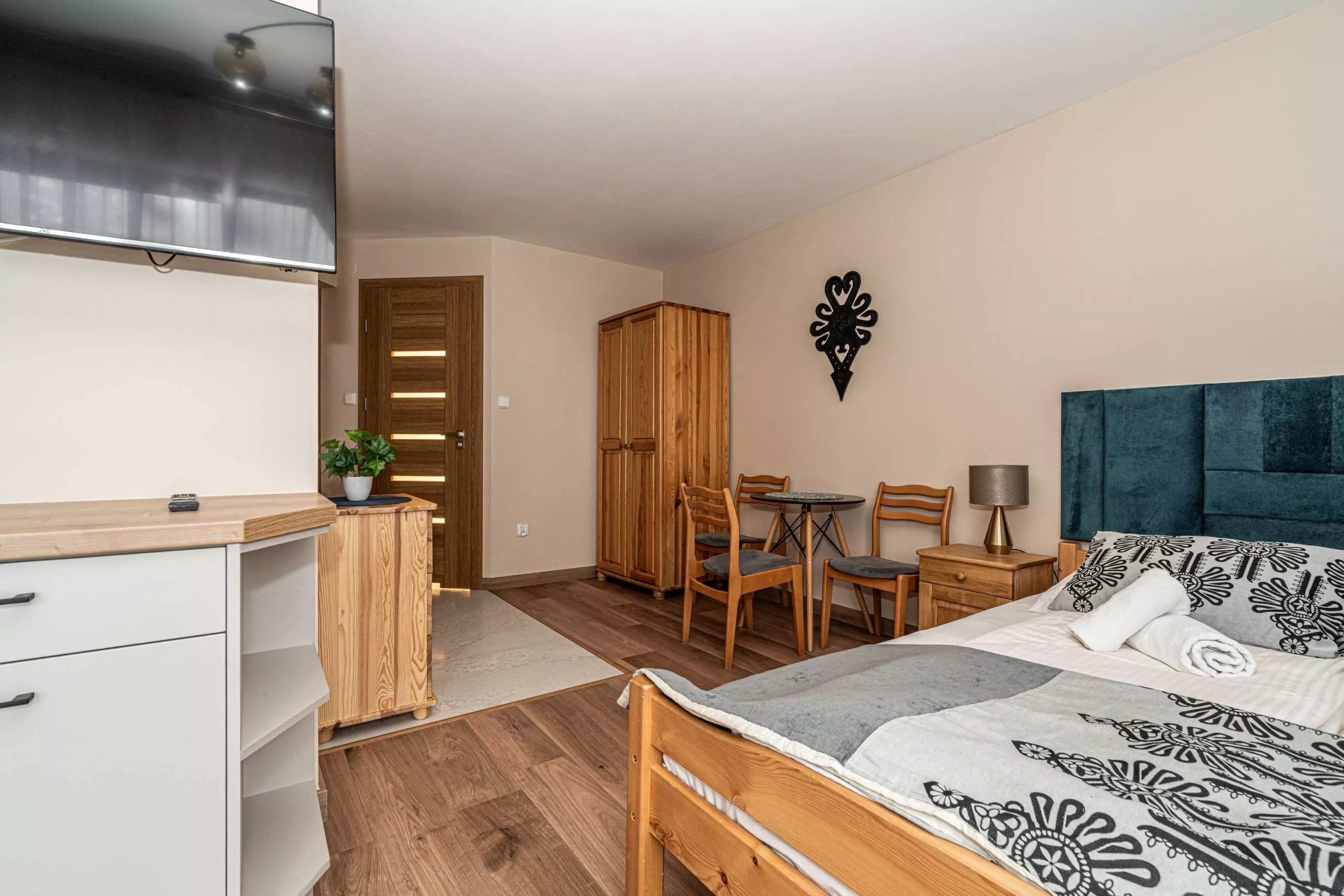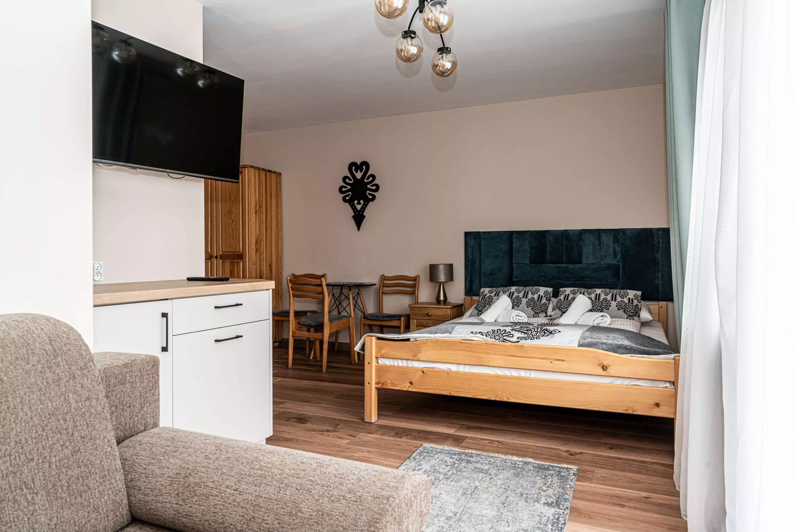 Studio składa się z przestronnej części sypialnianej oraz dodatkowej strefy wypoczynkowej, co pozwala na swobodne spędzanie czasu i zachowanie prywatności. Naturalne akcenty drewna, jasna kolorystyka oraz regionalne dodatki tworzą przytulny, górski klimat.