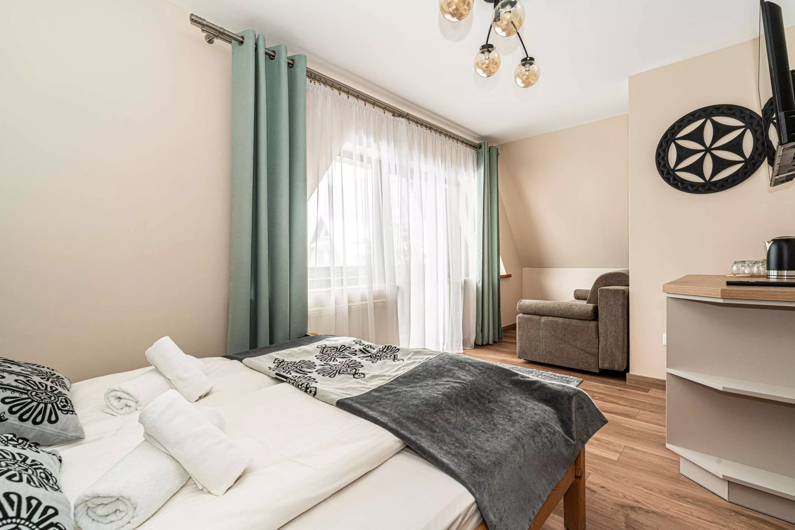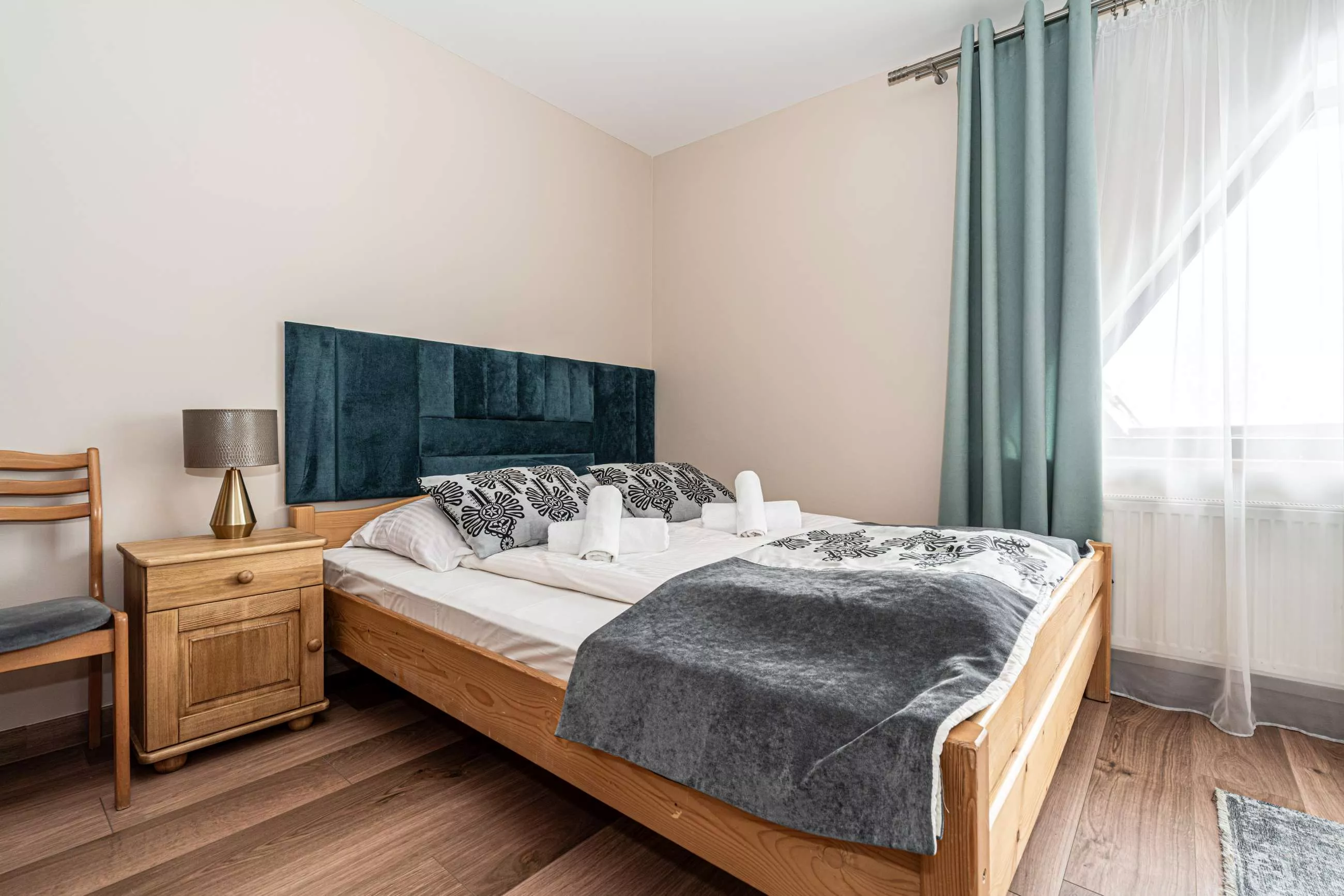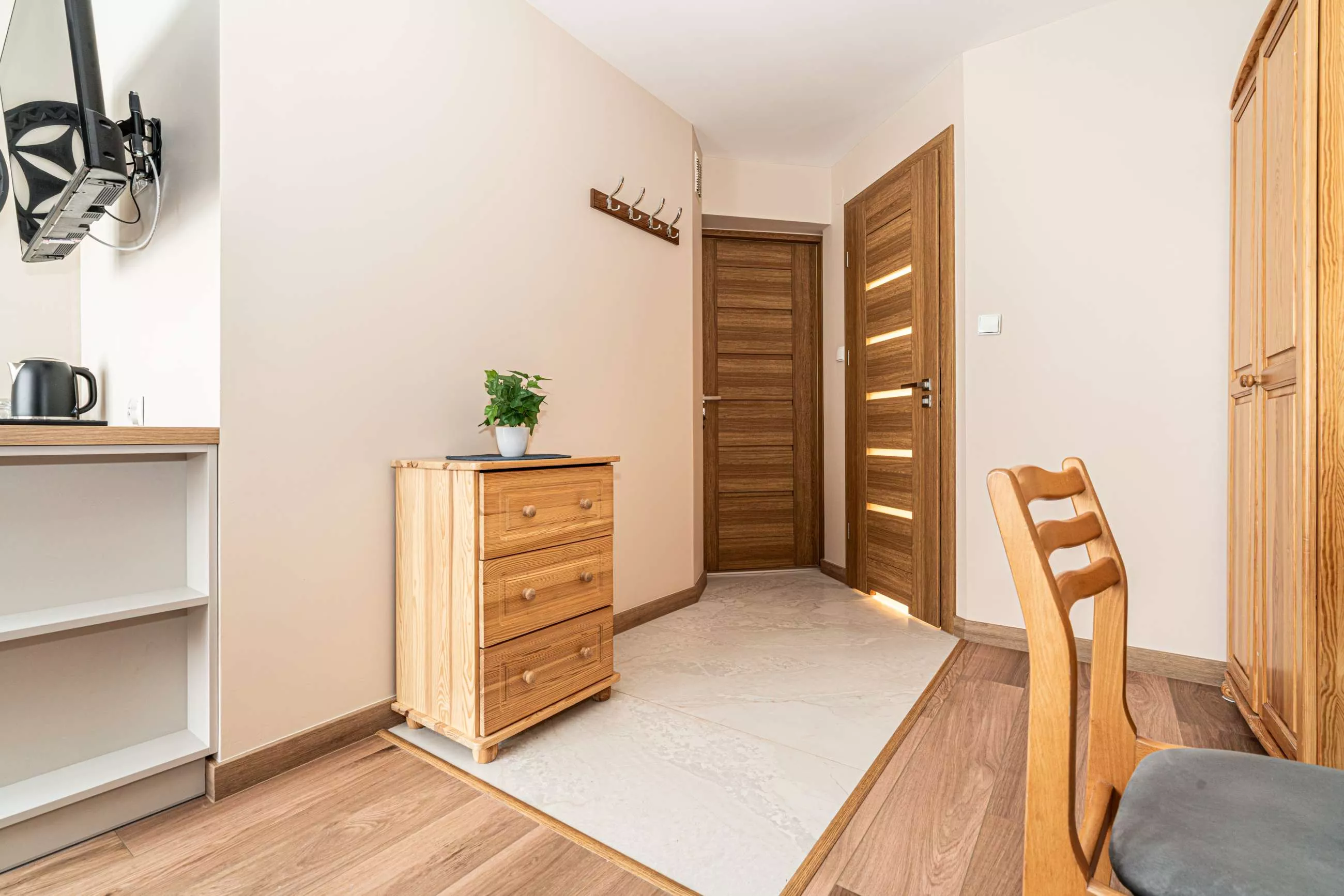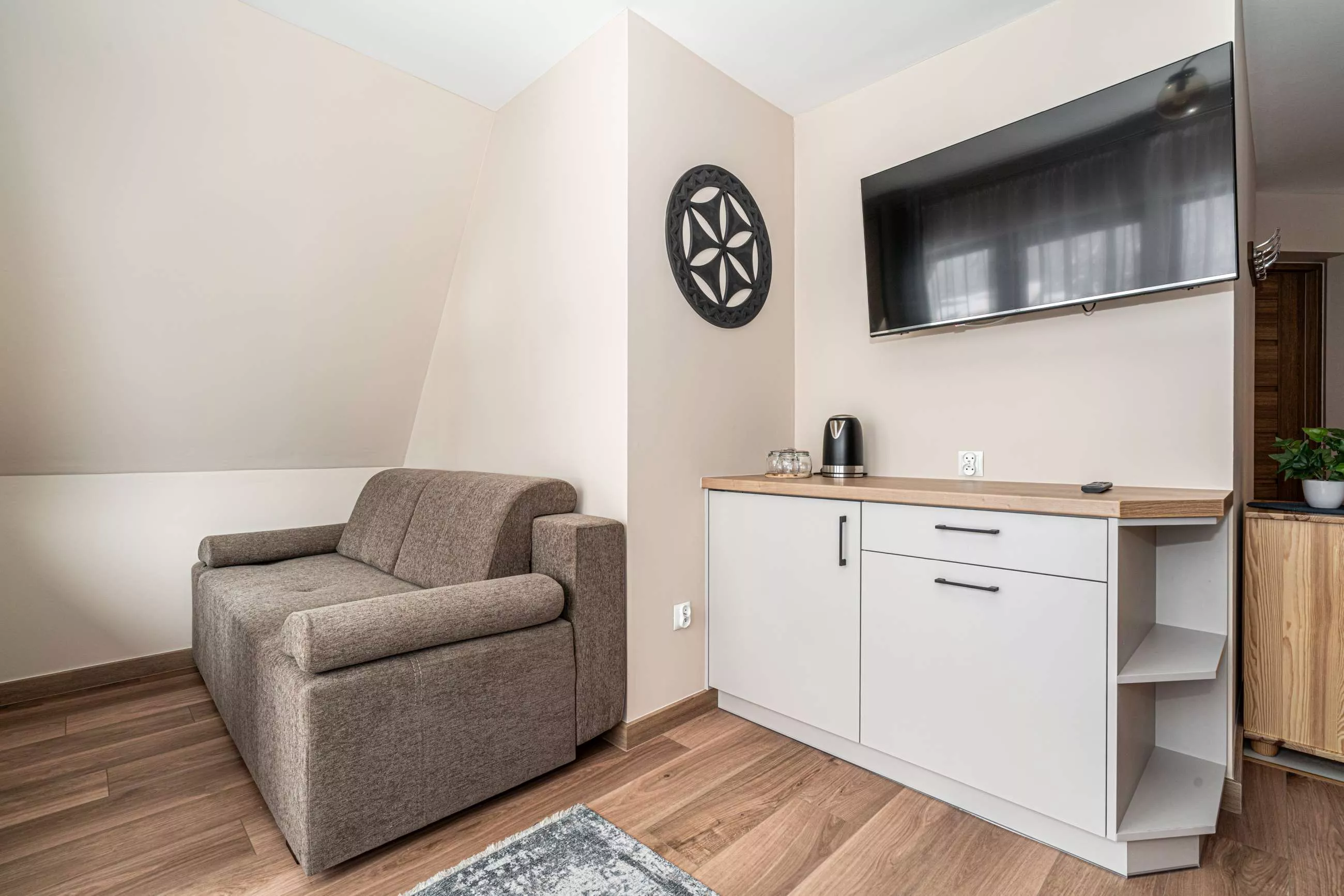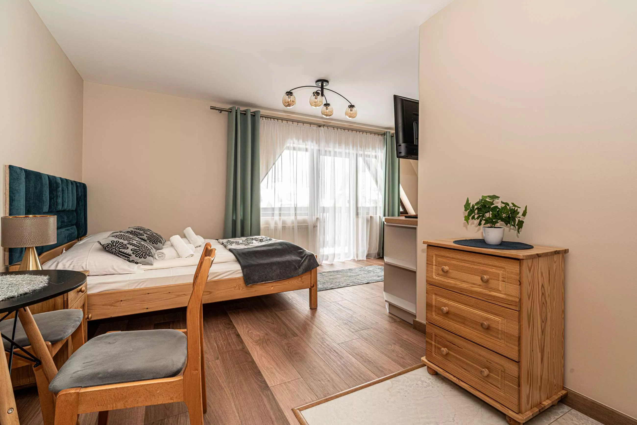 Studio składa się z przestronnej części sypialnianej oraz dodatkowej strefy wypoczynkowej, co pozwala na swobodne spędzanie czasu i zachowanie prywatności. Naturalne akcenty drewna, jasna kolorystyka oraz regionalne dodatki tworzą przytulny, górski klimat.
